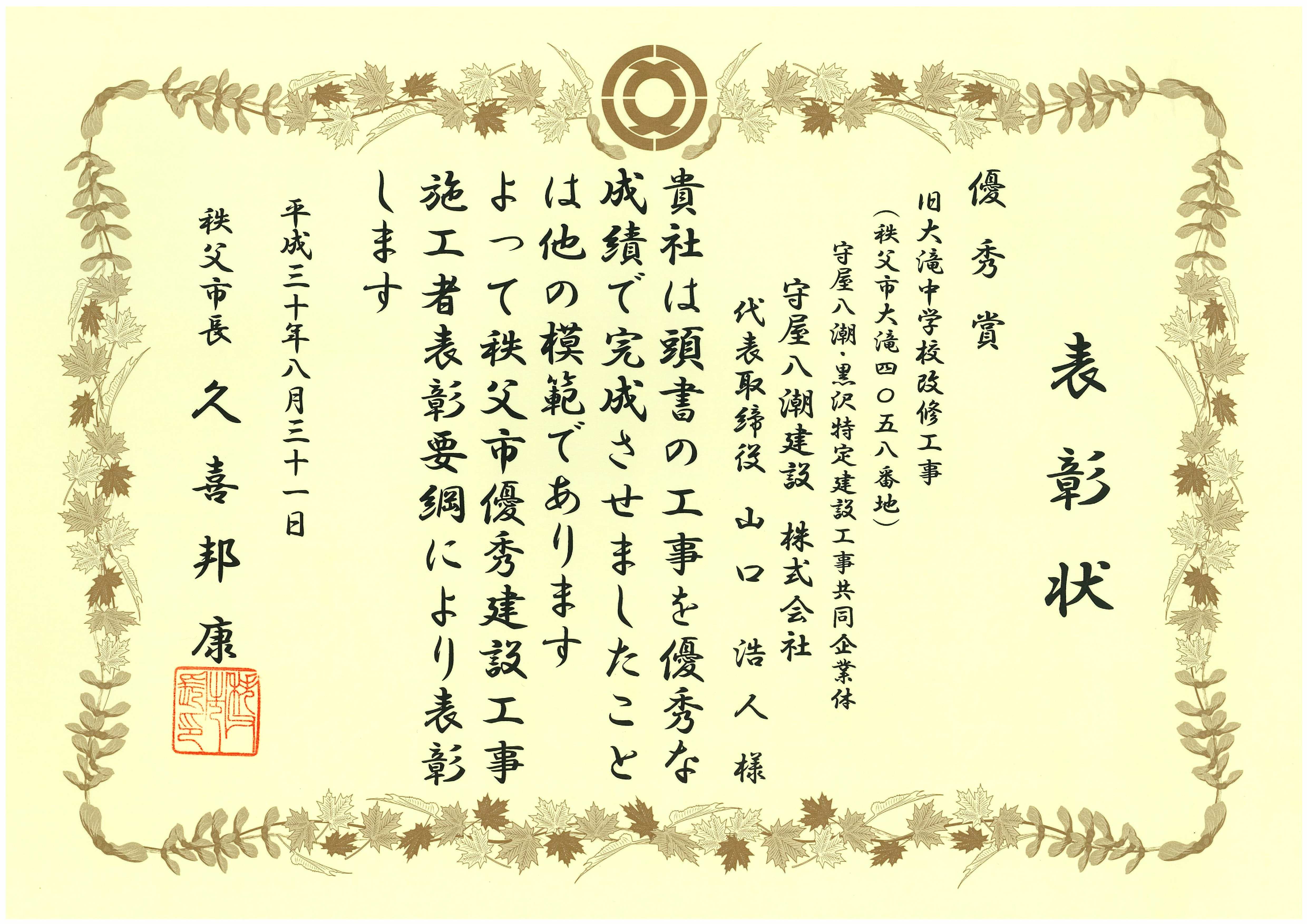 秩父市優秀建設工事施工者表彰