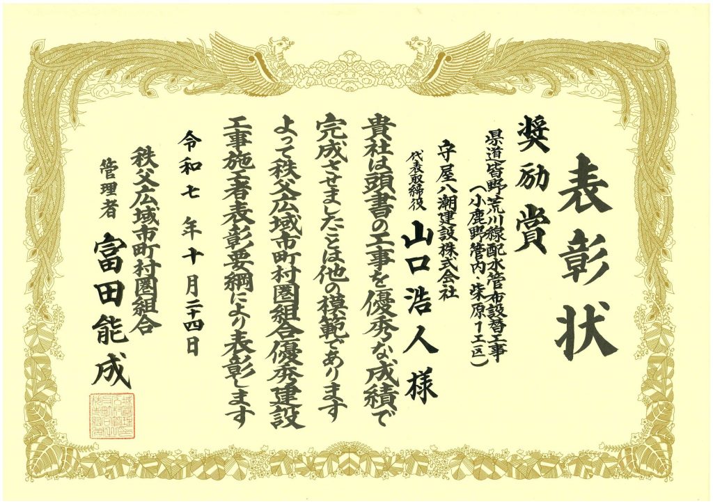 令和7年10月24日、県道皆野荒川線排水管布設替工事(小鹿野管内・柴原1工区)において 秩父広域市町村圏組合より秩父広域市町村圏組合優秀工事施工者【奨励賞】として表彰されました。